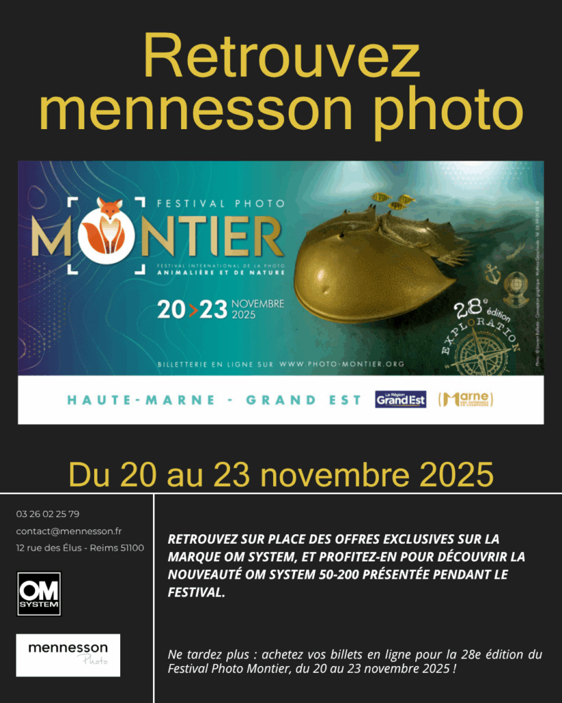 Pour sa 28ᵉ édition, le Festival International de la Photo Animalière et de Nature de Montier-en-Der accueillera pour la toute première fois Mennesson Photo, du 20 au 23 novembre 2025. Une occasion unique pour les passionnés de photographie nature de venir découvrir notre univers, échanger avec notre équipe et profiter d’offres exclusives spécialement préparées pour l’événement.