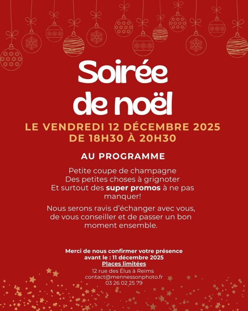 Mennesson Photo organise une soirée dédiée à Noël, avec des promotions exclusives et une ambiance vraiment conviviale. L’occasion idéale pour découvrir nos offres, poser vos questions et préparer vos cadeaux dans un cadre détendu.